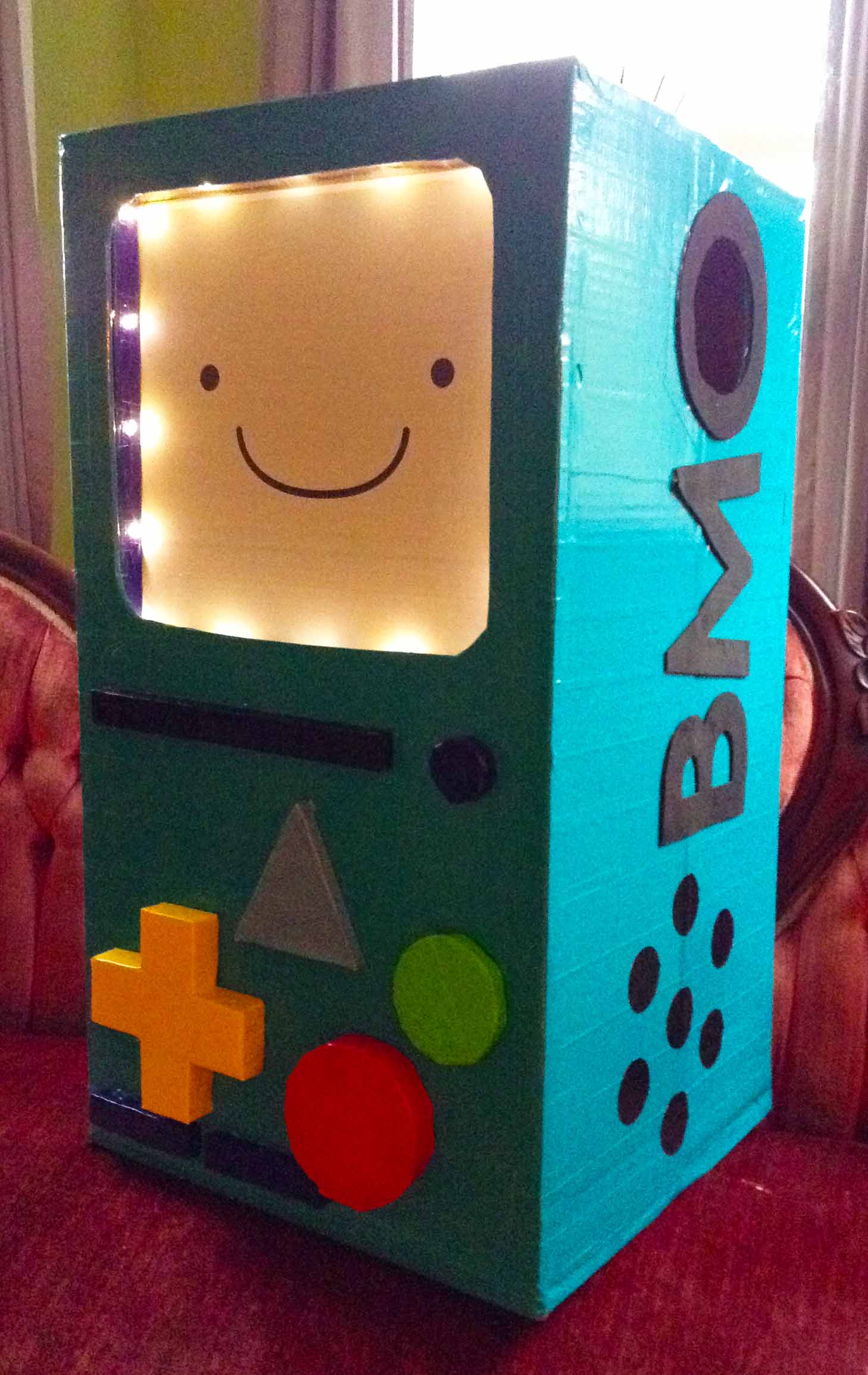 Daughters Halloween Costume – Halloween Costume of Cartoon Networks BMO, perfect replica with light up screen. Constructed from lots of duct tape, cardboard, LCD Lighting, foams and clear plexiglass.